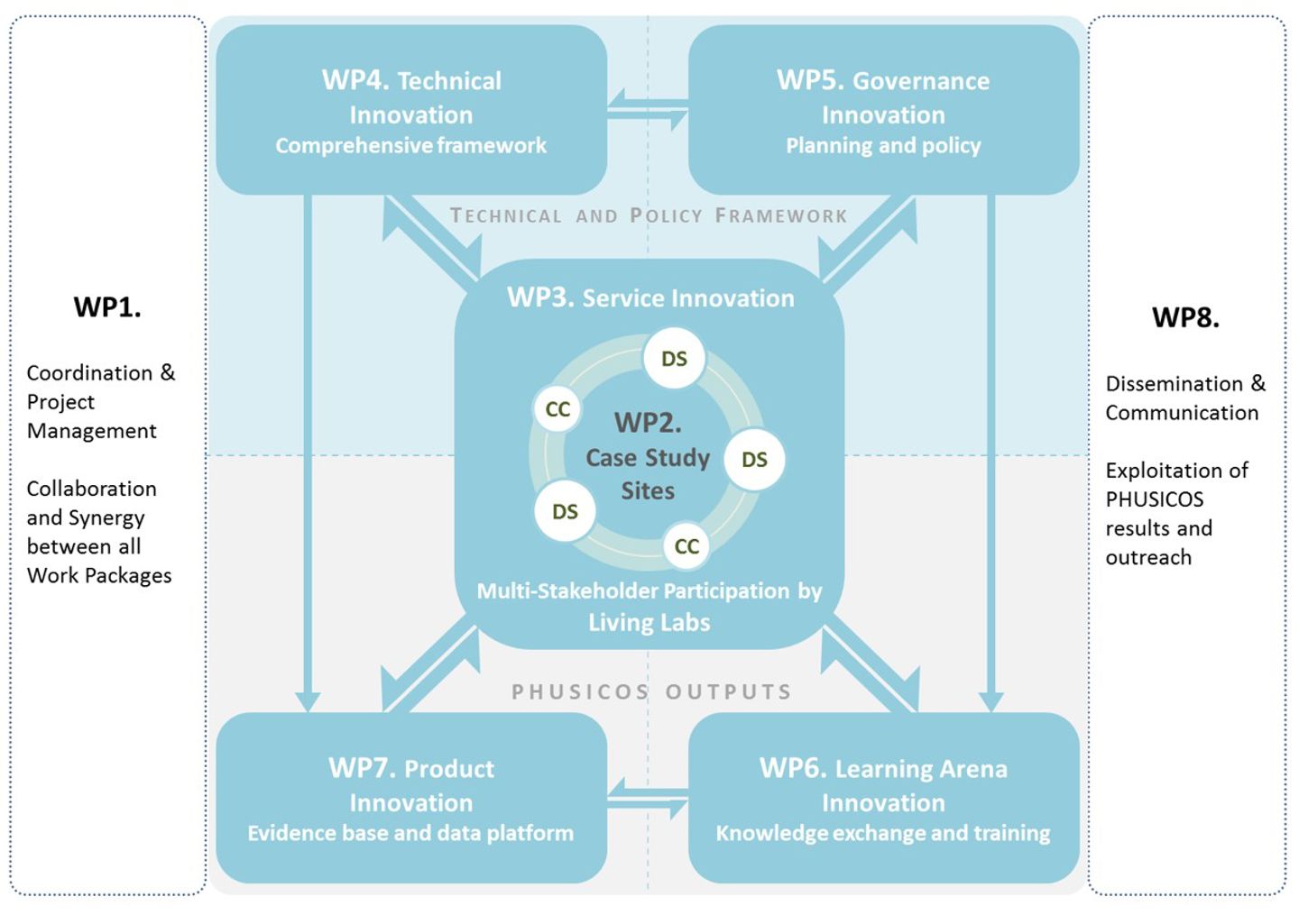 PHUSICOS work plan and project structure including all work packages (WPs), (DS = demonstrator site; CC = concept case)
