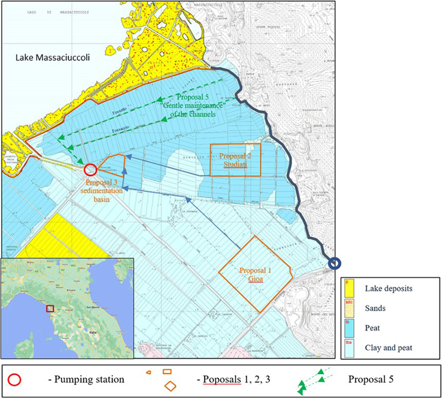 Overview of the surficial geology and proposed interventions at Lake Massaciuccoli, Italy. The pumping station is an existing infrastructure and not part of PHUSICOS. Proposals 1 & 2 are the buffer strips, whereas proposals 3 and 5 are the sedimentation basin and the canal modifications, respectively. The heavy blue line in the northeast is the Fossa Nuova Canal, through which the Water is led from the Serchio river via a pipeline with an outlet at the blue circle.