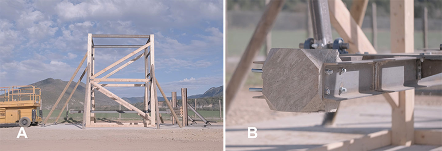 Photos of the battering ram installed in La Peña Estación, Spain. A) Overview of the whole structure of the battering ram, installed by PHUSICOS and aimed at testing different wooden structures. B) Detail of the concrete block aimed at emulating the rocks and equipped with sensors to monitor the impacts on the wooden structures.