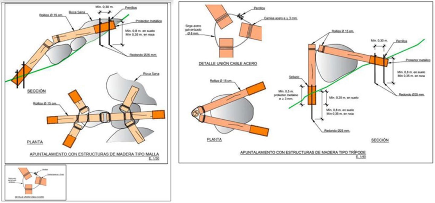 Photos of some of the NBS implemented in Artouste. A) Wooden barrier (passive measure) installed close to a release area to stop the eventual blocks. B) Wooden tripod (active measure) aimed at blocking potentially unstable blocks. C) Wooden trellis or lattice aimed at blocking many potentially unstable blocks.