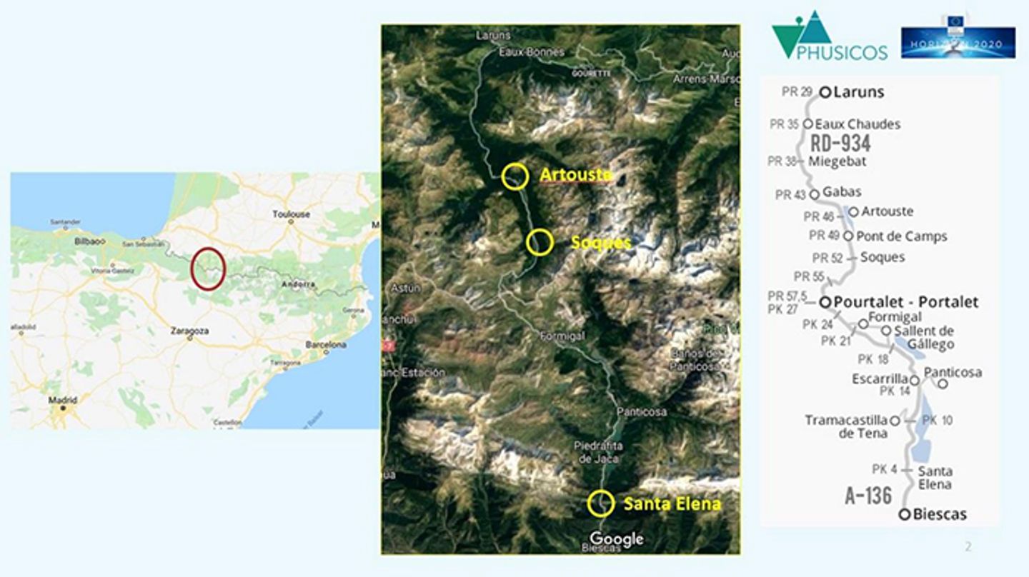 Location of the NBS sites at St. Elena, Spain, and Artouste, France, both defined as high-risk locations along the important trans-national road A-136 / RD-934. The proposed NBS intervention at Socques, also along the same road, was canceled.
