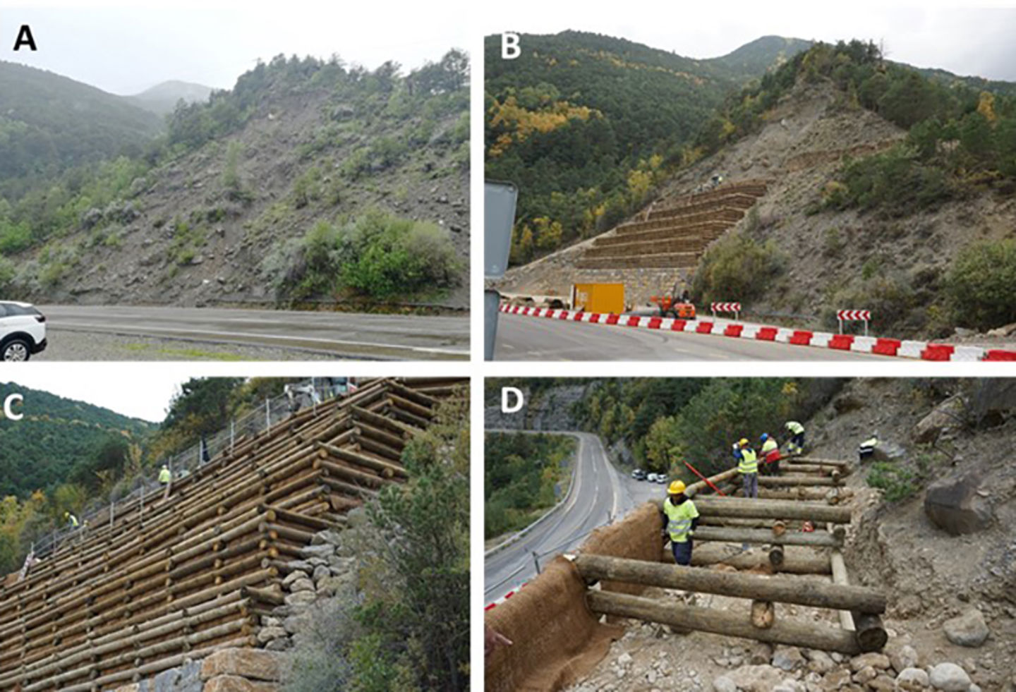 A) The till slope at St. Elena in June 2019. Loose blocks often hit the road, and small landslides often occur during heavy rain, exposing more blocks to threaten the road. B) The St. Elena slope on 11. October 2022. The road has been temporarily moved. The 7th of the ten planned terraces is being built. C) Close-up of the wooden terraces. D) Construction of the wooden gabions supporting the terraces. Notice the use of coconut mats on the outer parts of the gabions.