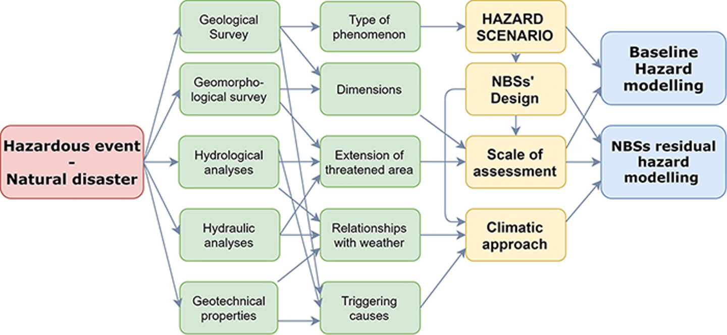 This analysis was carried out by implementing numerical modelling and analyses to map the hazard related to natural phenomena affecting the study areas with and without NBSs implementation. Since most of the natural hazardous phenomena are strongly affected by forcing weather events (e.g. rainfalls, snowfalls, heat waves), hazard modelling was developed for different climatic scenarios, following site-specific approaches, aiming to profitably assess the effectiveness of NBS interventions against the impacts of climate change.