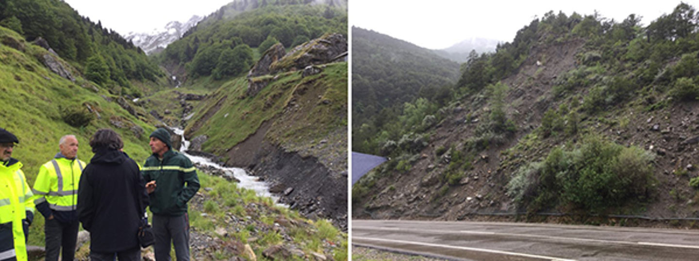 Left: Discussing NBS at the ravine at Socques, France, where torrents erode in the till deposits, and cause severe problems for the road. Right: The problematic end moraine (loose till slope) at Santa Elena, Spain.