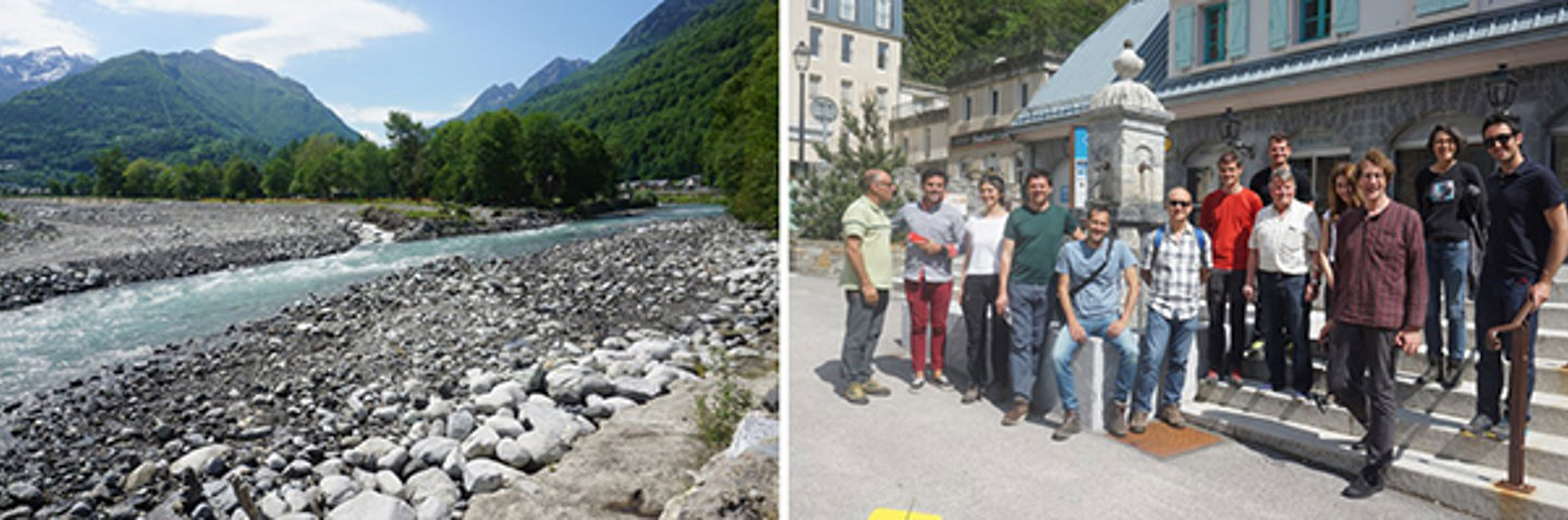 Left: The confluence zone between the Bastan and the Gavernie rivers, where recent flooding has deposited much sediments. Right: Visit in the village of Baréges, France. The deputy Mayor in the middle right (with white shirt).